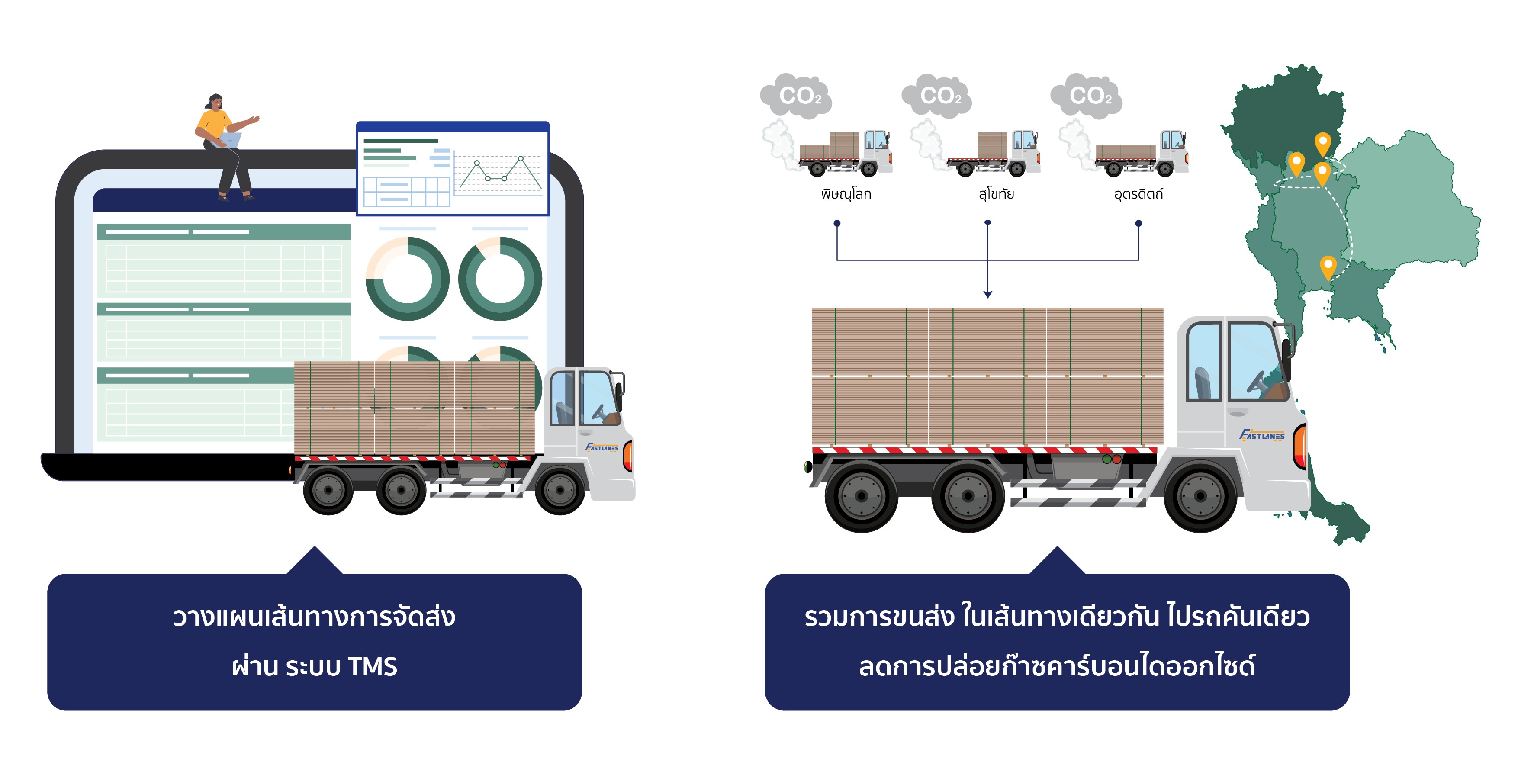 หากปัจจุบันคุณใช้รถของบริษัทในการจัดส่งสินค้า คุณต้องแบกรับต้นทุนคงที่ เช่น ค่าแรงพนักงาน ค่าน้ำมันและค่าซ่อมบำรุงรถ ซึ่งการจัดส่งสินค้าอาจมีการบรรทุกสินค้าที่ไม่เต็มลำหรือต้องใช้รถหลายคันในการจัดส่งเนื่องจากพื้นที่รถใส่สินค้าไม่พอ ปัจจุบันการเผาผลาญน้ำมันของรถบรรทุกมีการปล่อยก๊าซคาร์บอนไดออกไซด์เฉลี่ยต่อคันเท่ากับ 0.00274 ตันคาร์บอนไดออกไซด์ต่อลิตร หากคุณใช้รถที่บรรทุกสินค้าได้น้อยหรือไม่เต็มลำหลายคันในการจัดส่ง การปล่อยก๊าซคาร์บอนไดออกไซด์ก็จะมากขึ้นตามจำนวนคันที่จัดส่งสินค้า และเกิดรถบรรทุกเที่ยวเปล่าที่เป็นการปล่อยก๊าซคาร์บอนไดออกไซด์โดยไม่จำเป็นเพิ่มขึ้น